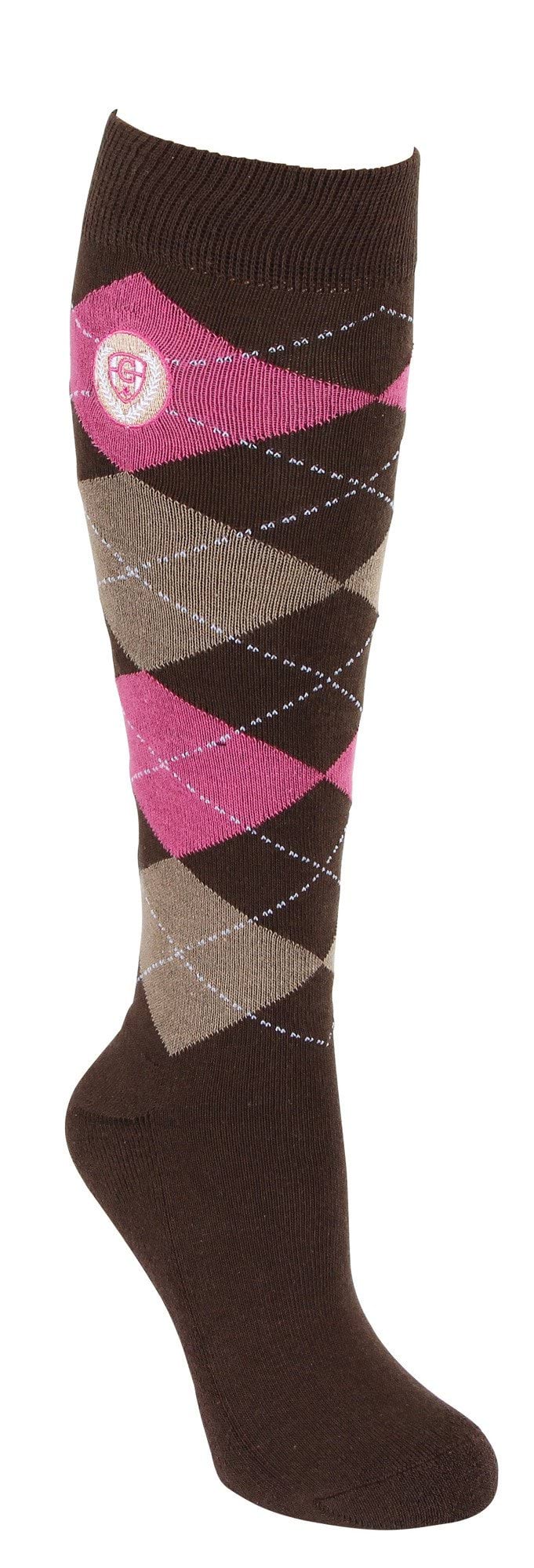 Dobrze dopasowany krój z szerokim ściągaczem u góry. Ze wzmocnieniem w obszarze stopy i grubszą od dołu stopką. Klasyczny wzór w romby. Prać w pralce w temperaturze 30 °C.