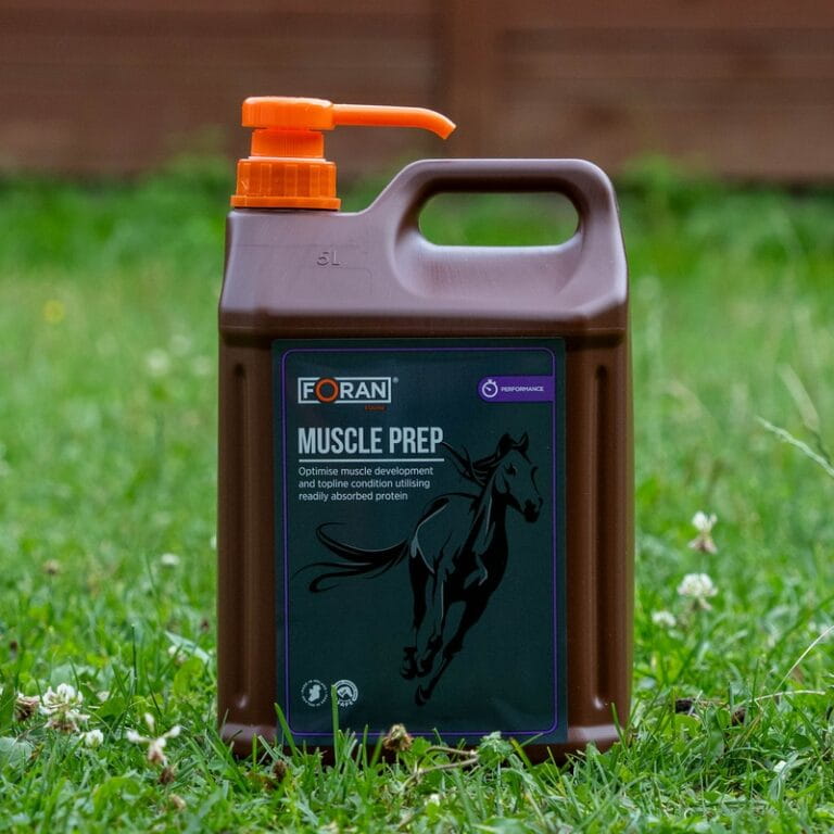 Suplement FORAN Muscle Prep wspiera rozwój mięśni i budowę linii grzbietu u koni.