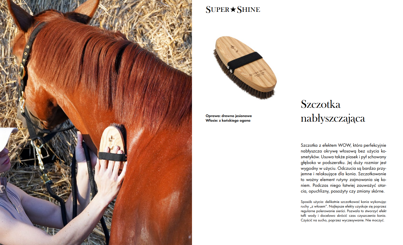 Sposób użycia: delikatnie szczotkować konia wykonując ruchy "z włosem". Najlepsze efekty uzyskuje się poprzez regularne polerowanie sierści. Pozwala to stworzyć efekt tafli wody i docelowo skrócić czas czyszczenia konia.
