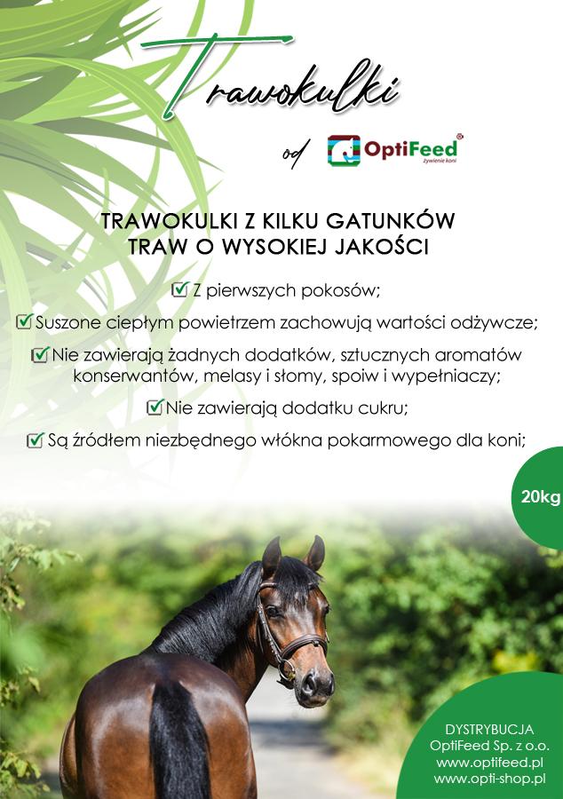 Mieszanka paszowa OptiFeed Trawokulki to źródło niezbędnego włókna pokarmowego dla koni. Zbierane z pierwszych pokosów i suszone ciepłym powietrzem. Zachowują wszystkie wartości odżywcze i nie są narażone na rozwój pleśni i grzybów. Bez dodatku cukru. Można je łączyć z paszą treściwą lub używać jako zamiennik paszy objętościowej dla koni. Trawokulki nie obciążają układu pokarmowego koni, stanowią najlepsze źródło wolnouwalnianej energii oraz nie powodują nadpobudliwości. Podawane na sucho lub na mokro, spowalniają spożywanie paszy treściwej i regulują procesy trawienne.