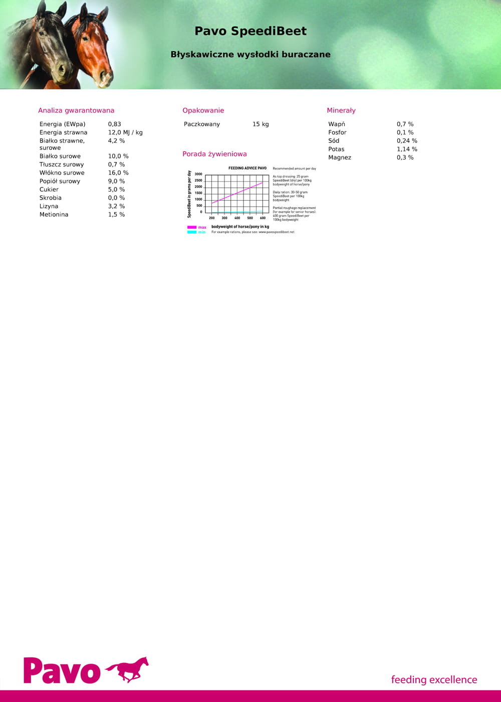 Pavo SpeediBeet to źródło włókna, które wspomaga prawidłowe funkcjonowanie układu pokarmowego. Nie zawiera melasy i innych dodatków. Opatentowana technologia produkcji Pavo SpeediBeet ułatwia szybkie wchłanianie wody- posiłek jest gotowy w ciągu 10 minut od zalania wodą.